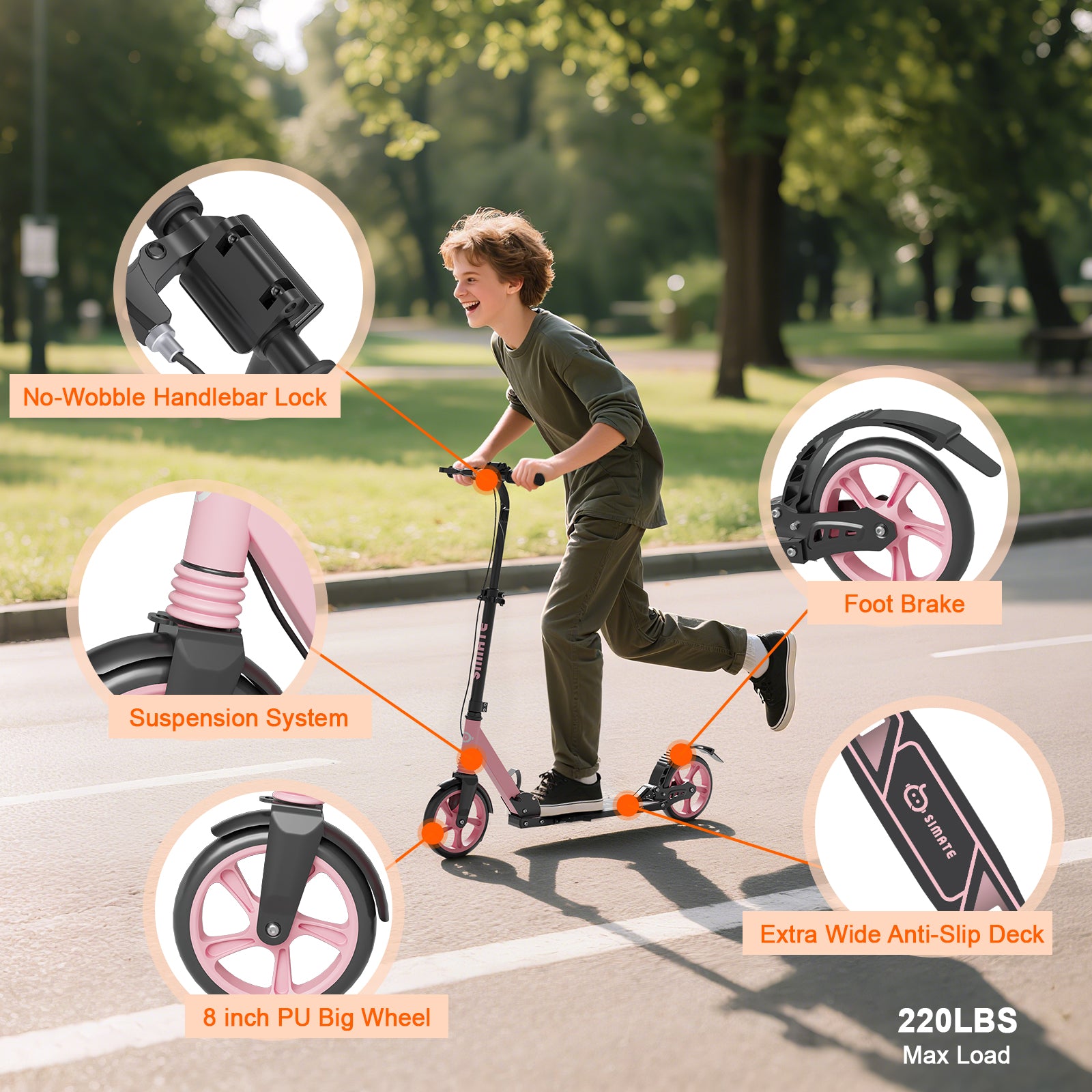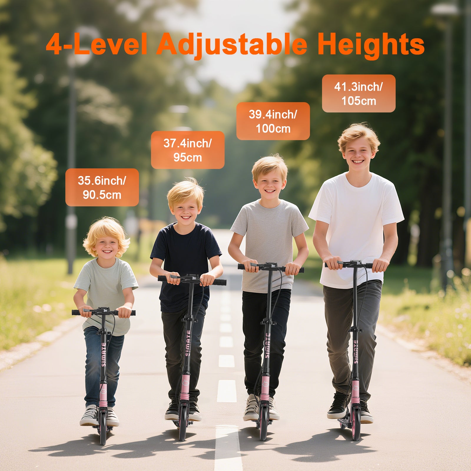 • ADJUSTABLE HEIGHT: Supports 3.9 FT - 6.2 FT height riders. The handlebar is adjustable to 4 height options (31”, 33.8”, 36.4”, 39”), The perfect family scooter, the same scooter can be used by parents and daughter and son riding