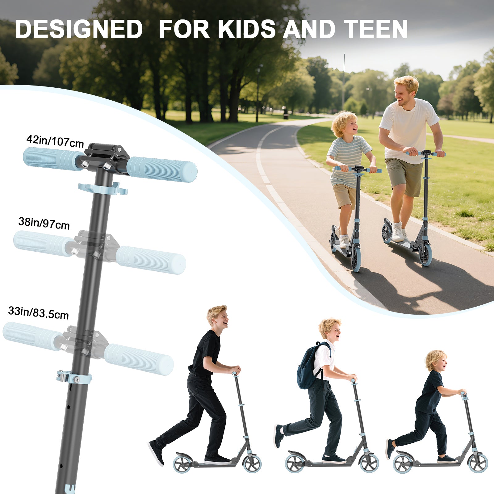 • 3 Adjustable Heights: SIMATE T1 Pro kick scooter, the handlebar is adjustable to 4 height options (33”, 38”, 42”), the perfect family scooter, the same scooter can be used by parents and children riding together